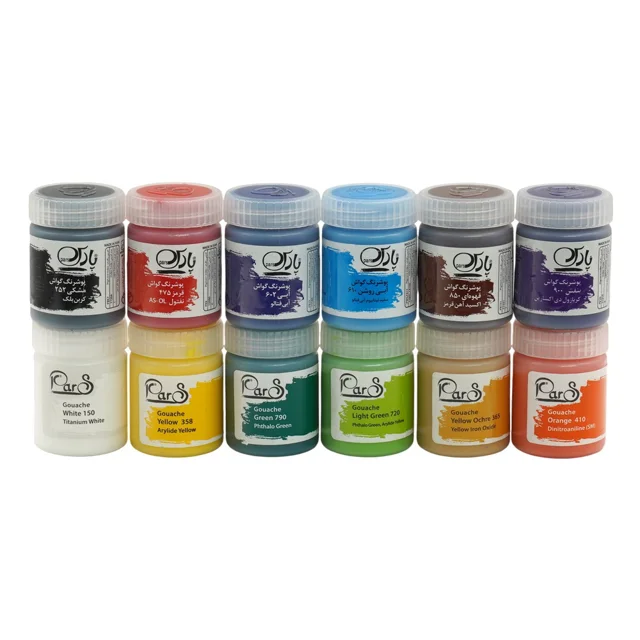 گواش 12 رنگ پارس، مجموعهای کامل و با کیفیت برای نقاشی حرفهای و آماتور، شامل ۱۲ رنگ زنده و پررنگ با پوشش عالی، خشک شدن سریع و قابلیت ترکیب آسان رنگها، مناسب برای مدارس، هنرمندان و علاقهمندان به هنر نقاشی.