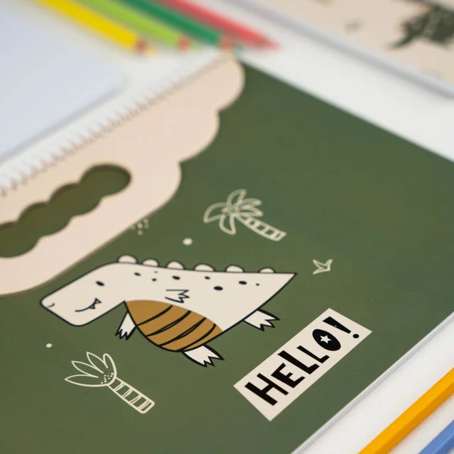 خلاق است. جلد سبز با تصویر دایناسور بامزه و نوشتهی «HELLO!» حس ماجراجویی را در